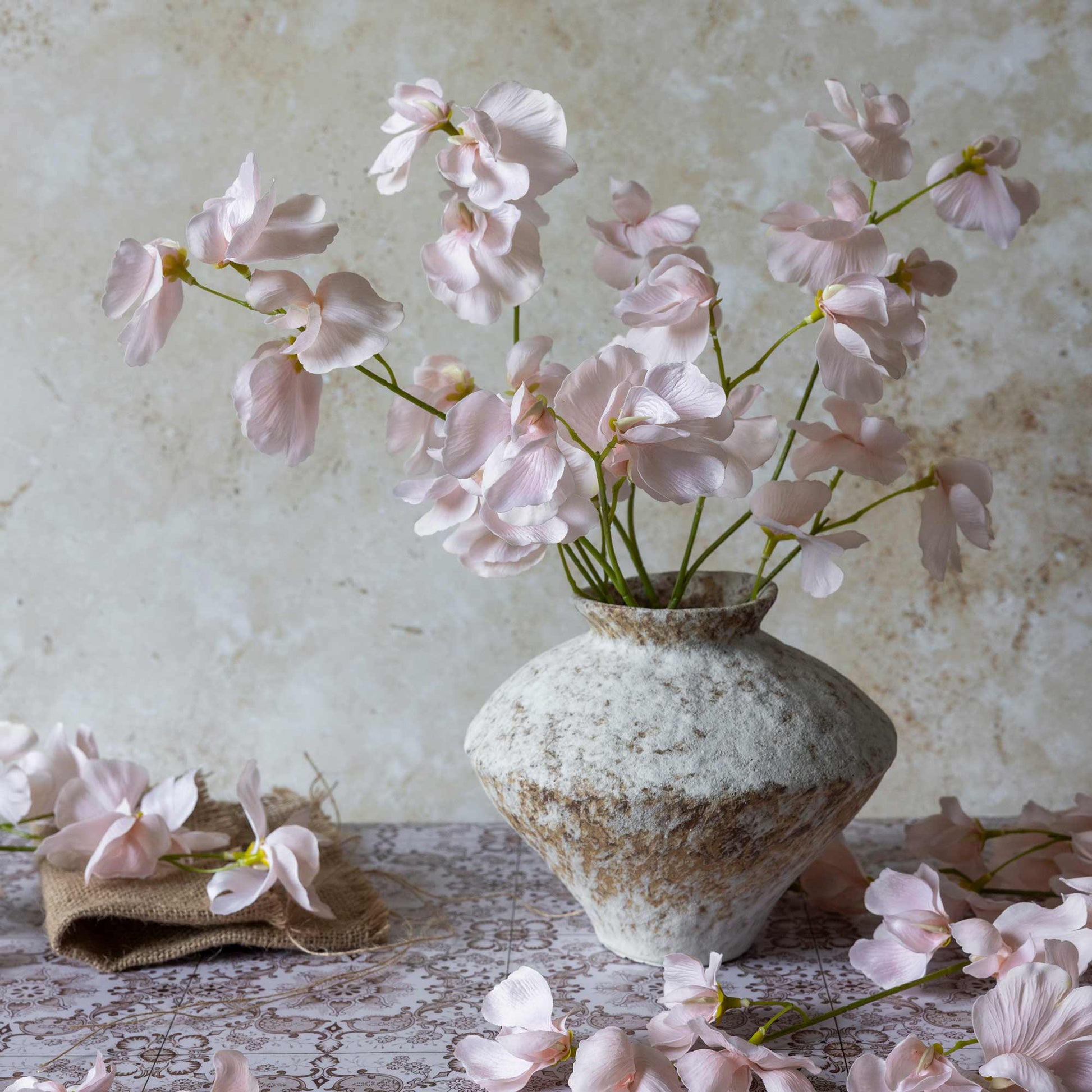 With the softest whisper of blush, this amazing faux Sweet Pea personifies summer. Gathered in a vessel they'll look effortlessly beautiful - and even more delightful, they're real touch! Emulating a real sweet pea, but with all the lasting wonder of faux florals, we can't get enough of this botanical.