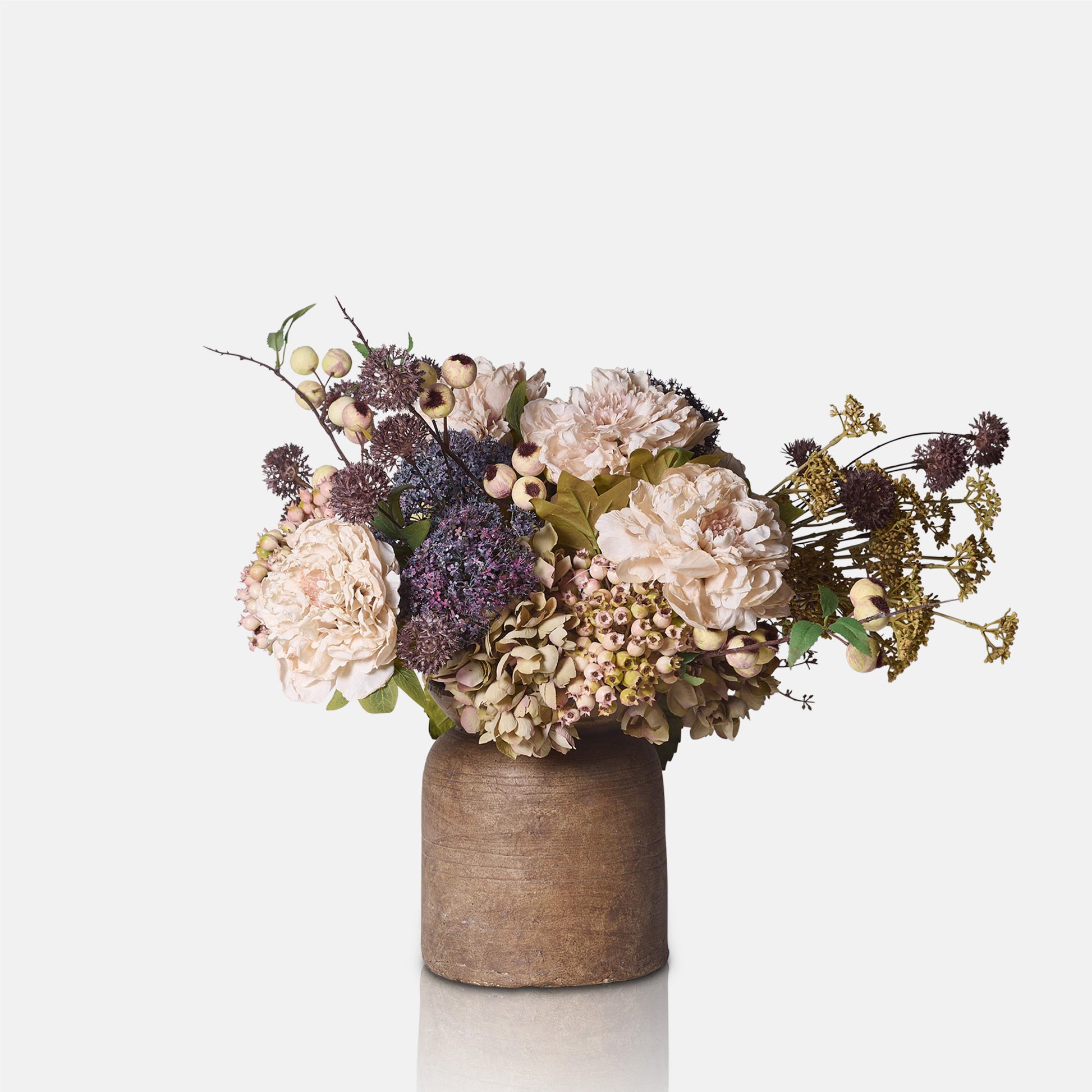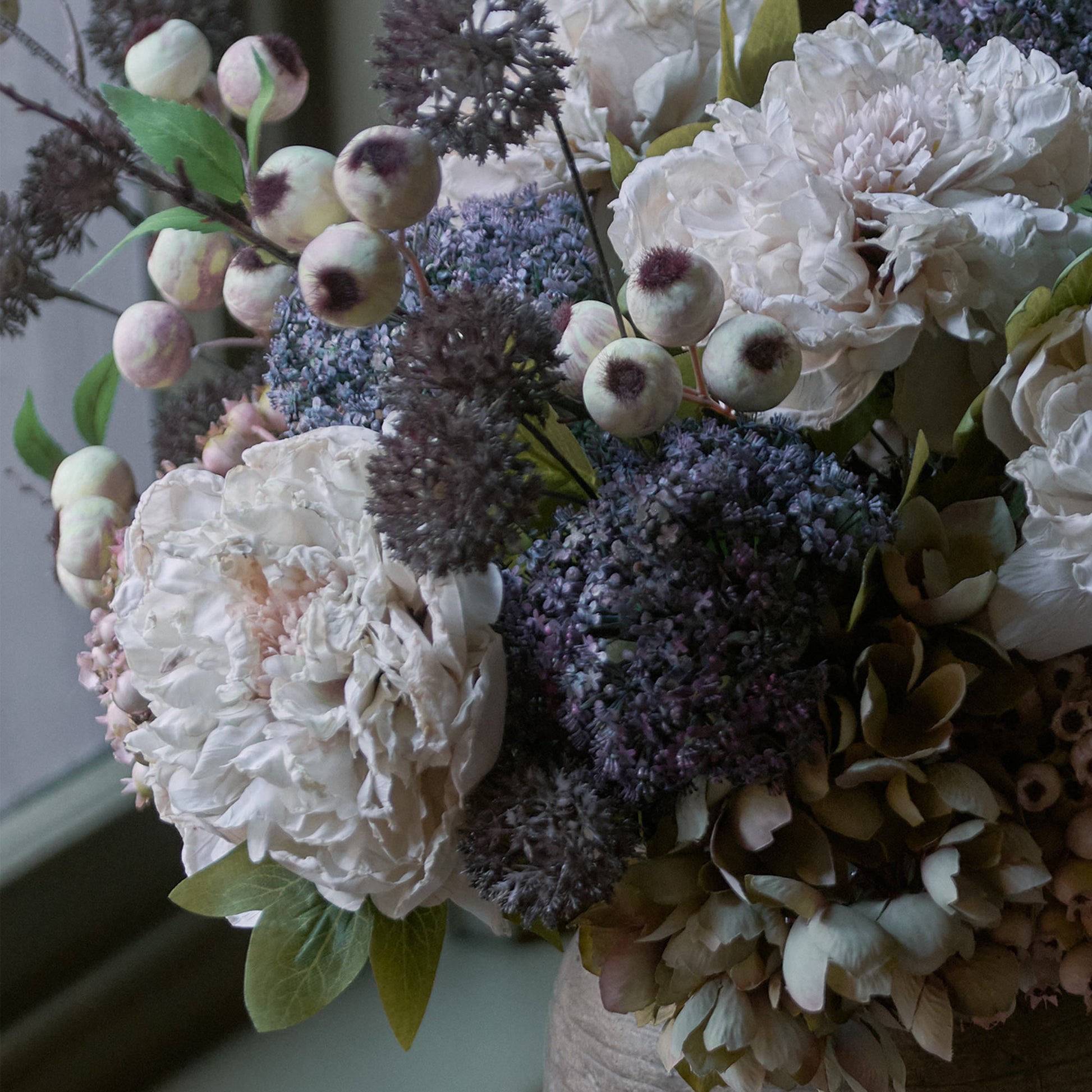 Grand and impactful, our Bilbury Bouquet has an immediate wow factor however you choose to style it. With bountiful heads of faux hydrangeas and peonies complimented by the inky hues of the trachelium and textural pops of berries, this faux flower bouquet is made up of 24 stems that will take centre stage no matter where it goes.